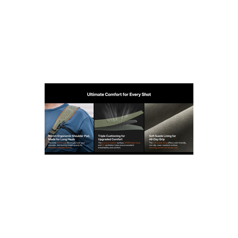 Comfort is a key element in the design of the Camera Shoulder Strap Pro. The strap uses high-resilience EPDM foam combined with 56 ventilation holes that improve air circulation and reduce heat buildup during long shooting sessions. The ergonomic shoulder pad is 2.4 inches wide, which ensures even weight distribution and reduces strain on the shoulder and neck.