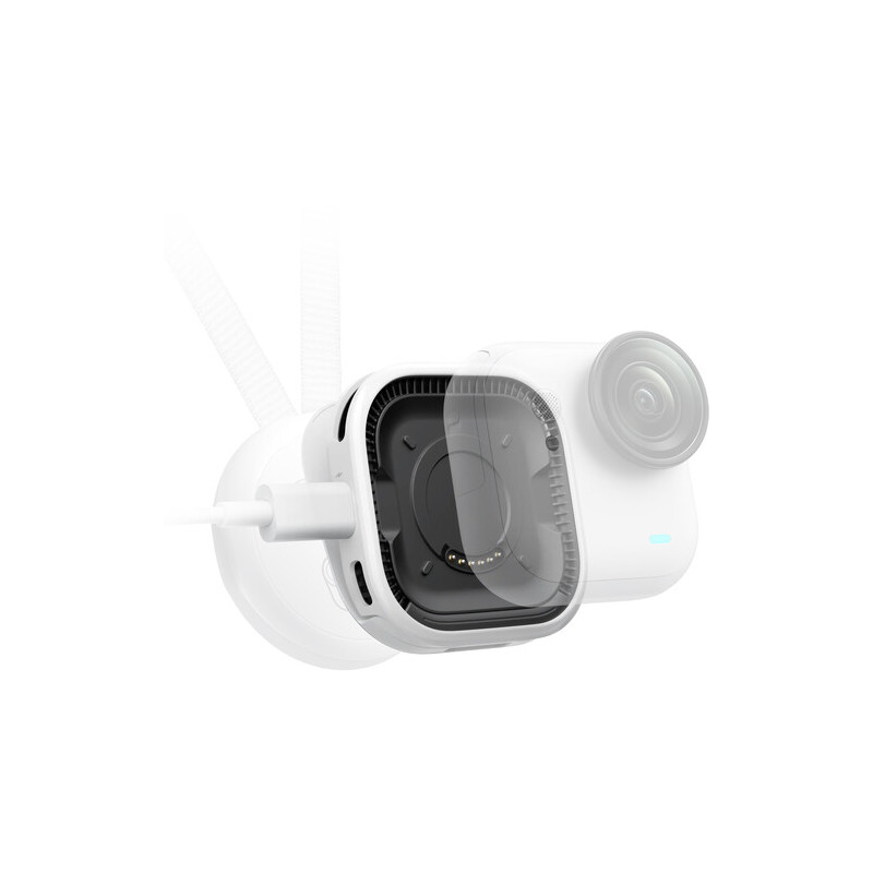 The mount uses a magnetic base with a Pogo Pin interface, which provides a secure hold and reliable electrical contact with the camera. This allows the GO Ultra to be both securely attached and powered, without the need for additional cables to the camera itself. Power is supplied via a USB-C input operating at 5 V and 3 A, ensuring continuous operation during longer sessions.