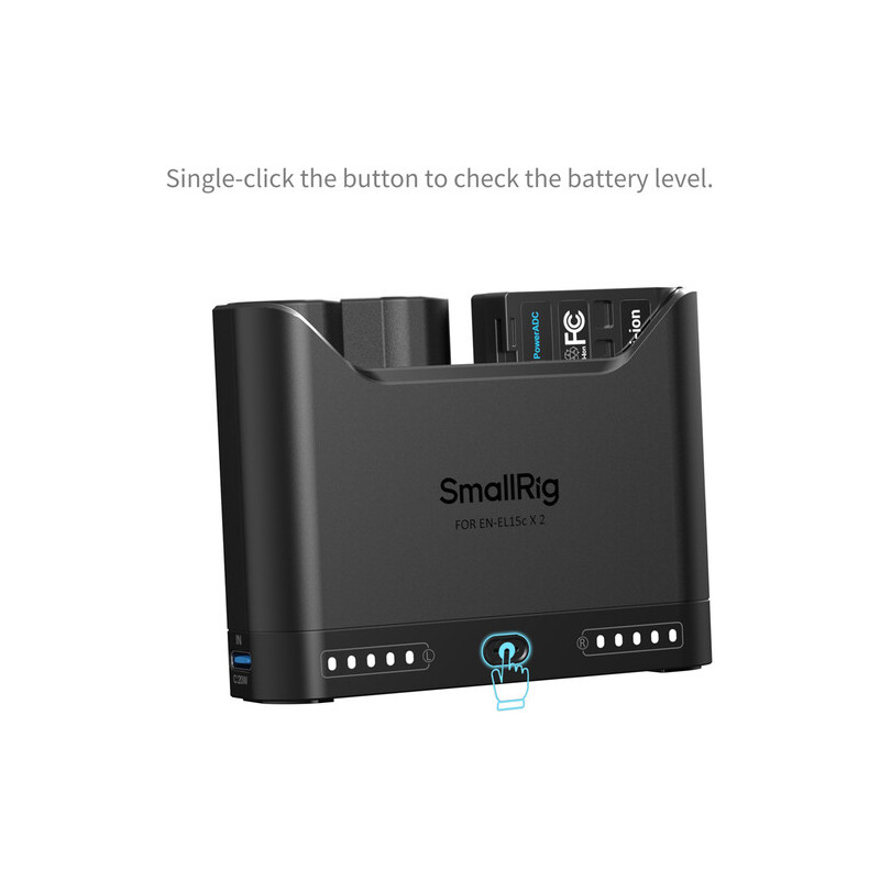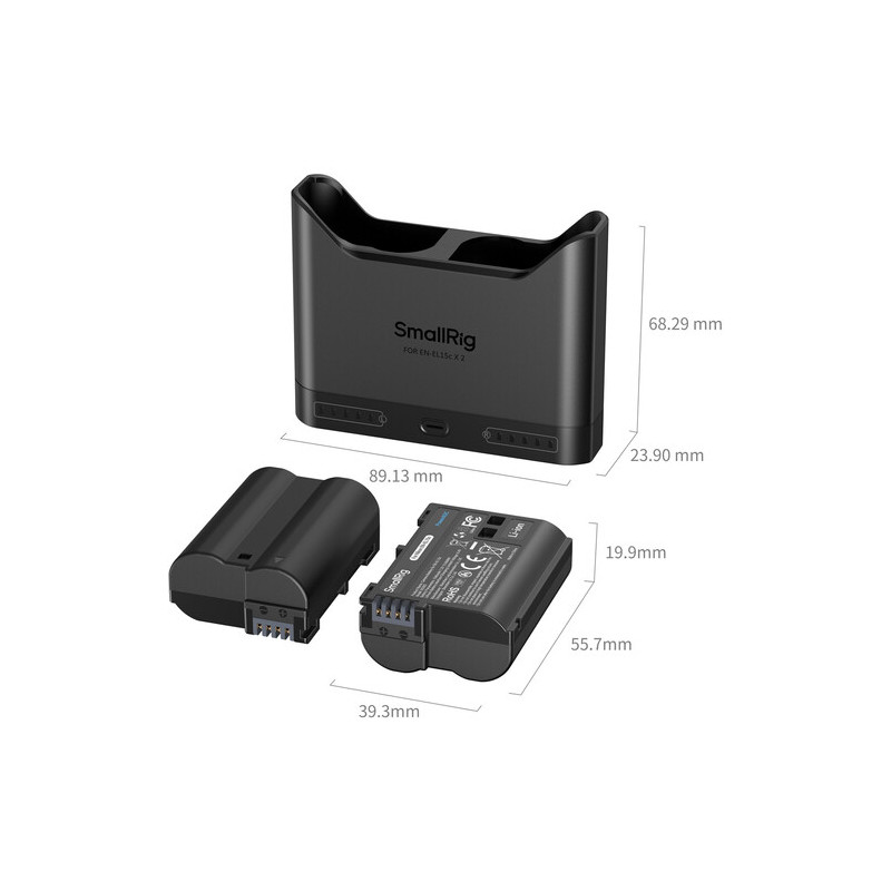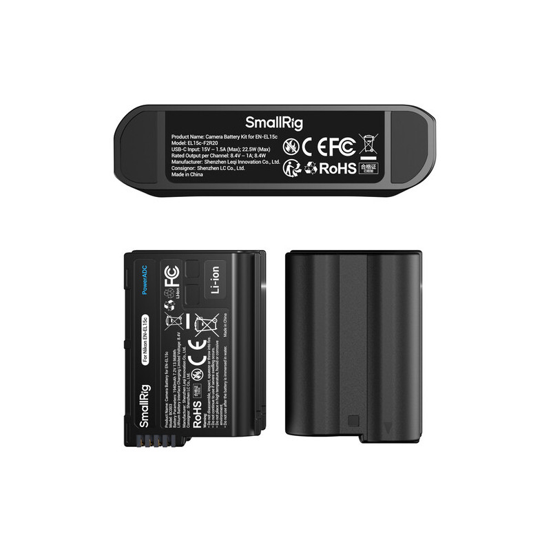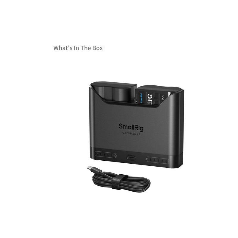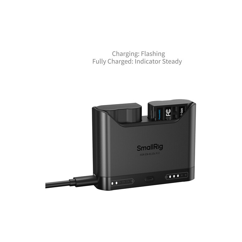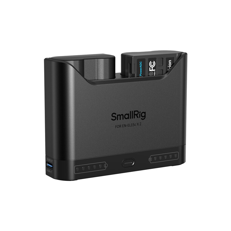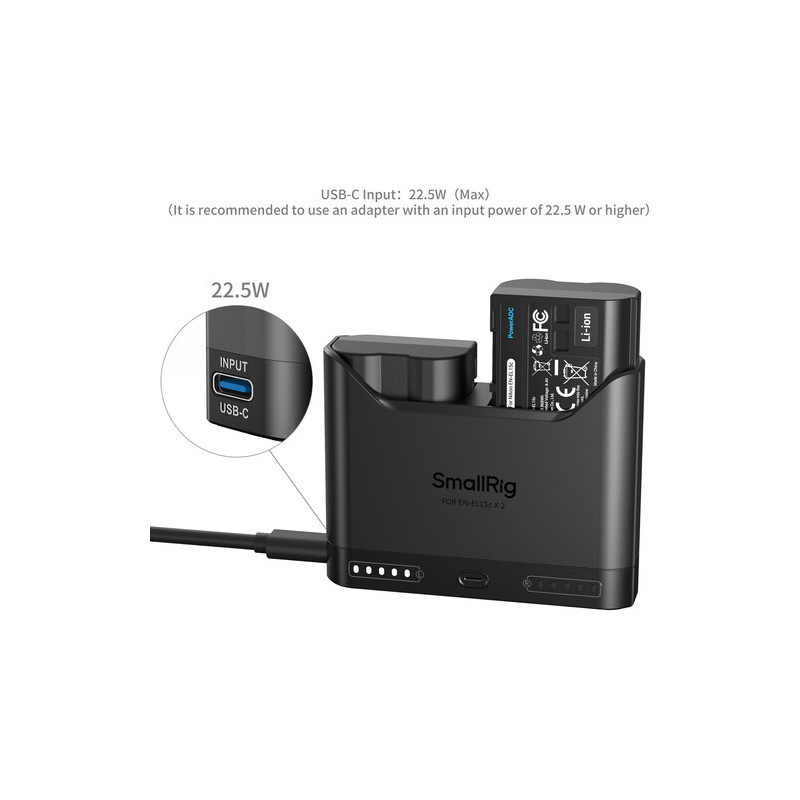 The SmallRig 5486 Turbo Charging Kit for EN-EL15C batteries offers a fast charger and two batteries. The charger has two slots for simultaneous charging, and the two included batteries have a capacity of 1940mAh, the kit is compatible with both original and non-original batteries. The USB-C input allows connection to various power supplies, and the intelligent protection monitors overheating and overvoltage, automatically adjusts the charging speed, and uses trickle charging at near-full capacity to extend the battery life. The five-level LED indicator shows the charging status, and the kit also includes a USB-C cable, ready to use right away.
