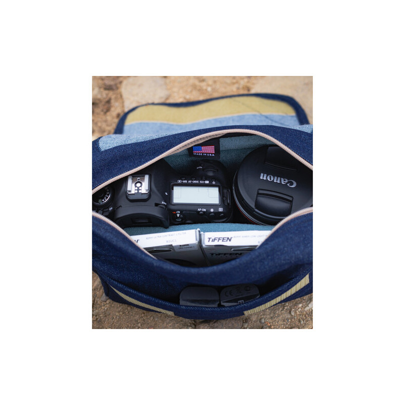 The Domke F-5XB Denim bag is a convenient and compact model that can comfortably accommodate your DSLR or mirrorless camera, 1-2 lenses, filters, and small accessories.