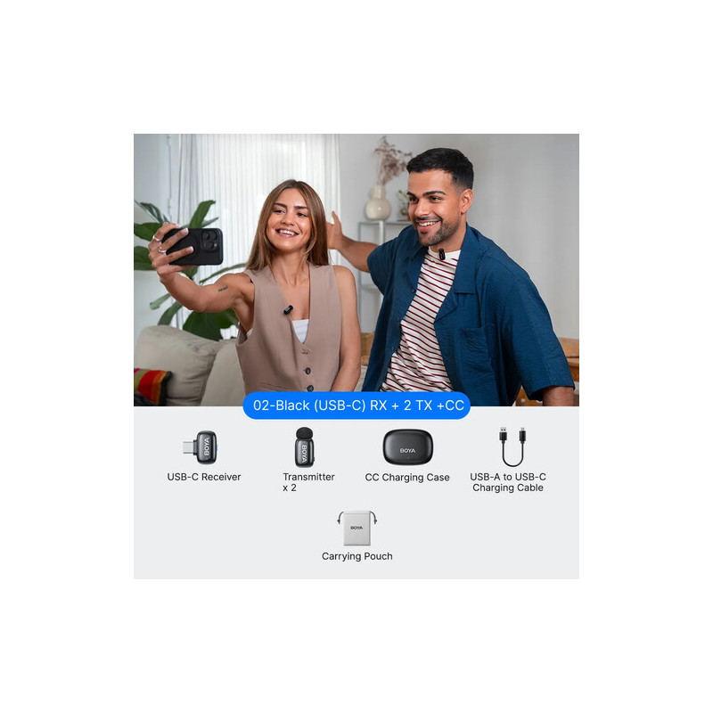 The BOYA Mini 2-02 Wireless USB-C Microphone System is a modern wireless microphone system with a clip-on design, designed for mobile video recording, podcasting, interviews, and streaming with smartphones and other devices with a USB-C port. The system is aimed at content creators who seek discreetness, automatic level control, and reliable sound without having to deal with complicated settings.