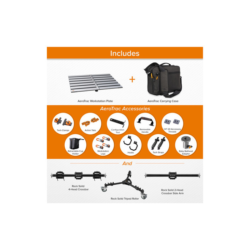 At the heart of the kit is the AeroTrac rail system, which provides exceptional configuration flexibility. Included Tech Clamps allow for secure attachment to stands, tripods, and roller bases, while Action Tab modules make it easy to quickly attach and rearrange accessories. 1/4"-20 threads let you add monitors, hubs, lights, recorders, and other key elements right where they're most convenient.