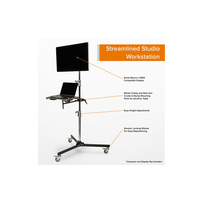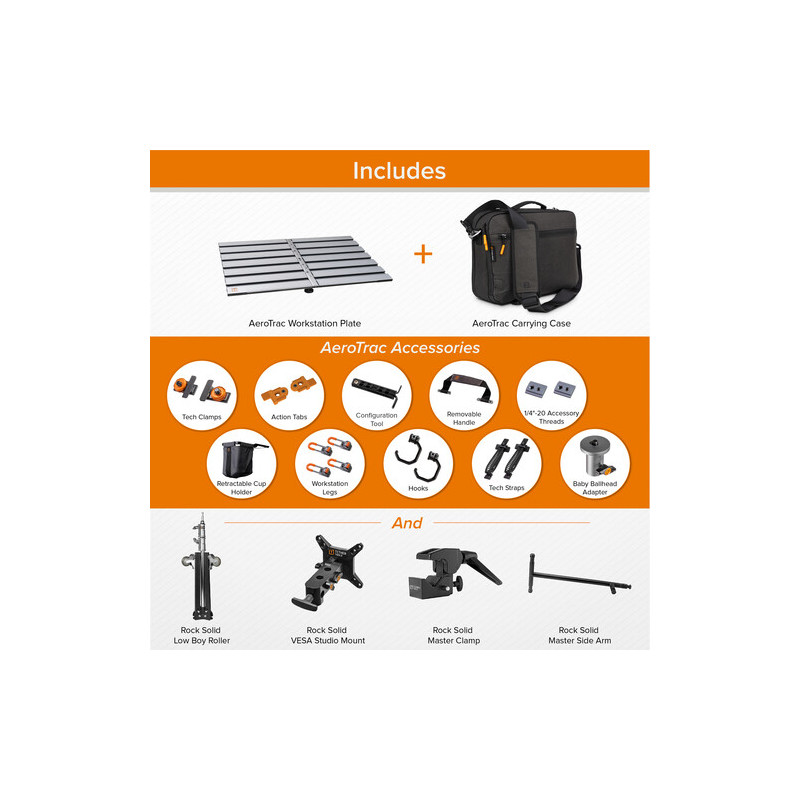 The Ultimate Kit upgrades the standard AeroTrac system with professional Rock Solid components. The Master Clamp and Master Side Arm allow for solid attachment to stands, pipes, and tripods, while the VESA Studio Monitor Mount provides a secure studio monitor mount directly to the workstation. The LAJO Lo-Pro Bracket adds a low-profile accessory mount, keeping your work environment clean and tidy.