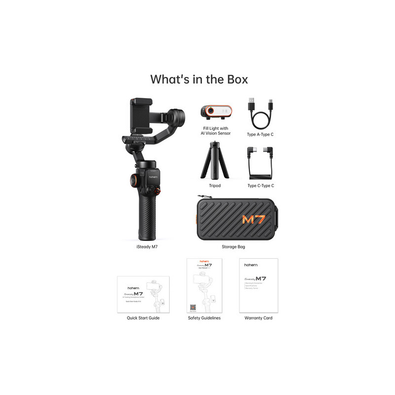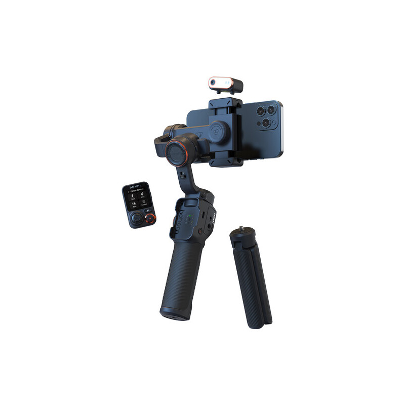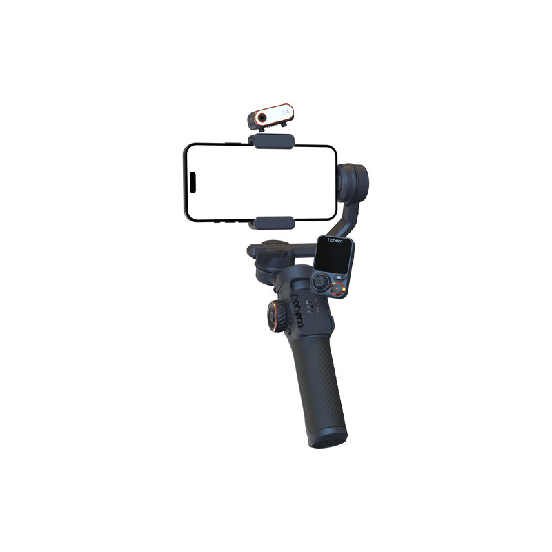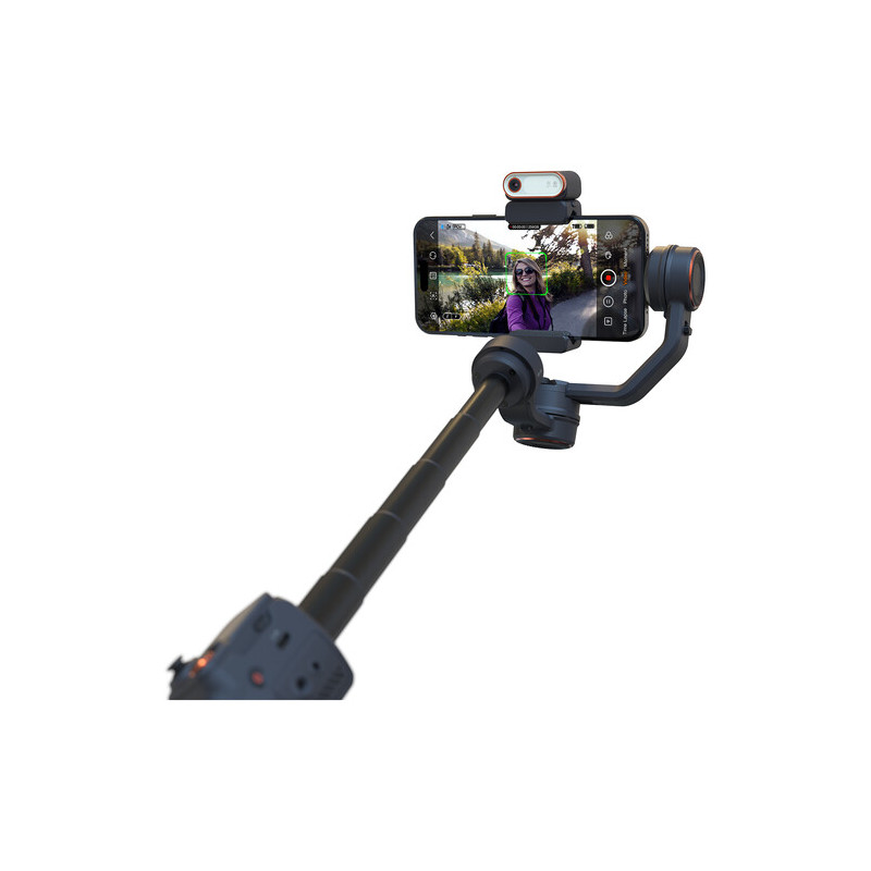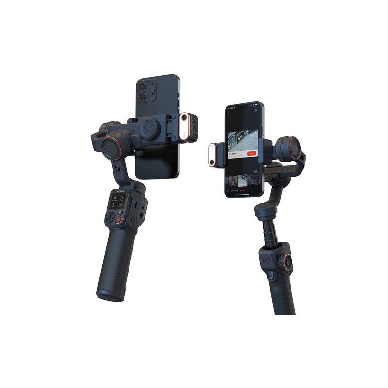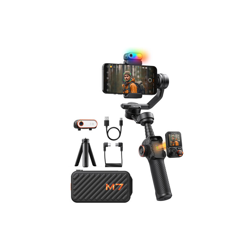The Hohem iSteady M7 video stabilization system is a 3-axis smartphone gimbal designed for stabilized mobile video shooting with advanced smart features. It supports phones with a width of 58 to 90 mm and a thickness of up to 12.5 mm, with a maximum load of up to 500 g, which allows the use of larger models with additional accessories. The stabilization works on all three axes with a wide range of motion and is complemented by a variety of modes such as Pan Follow, Pan & Tilt Follow, POV, Lock, Sport and Ultra-wide, as well as functions for panoramas and motion timelapse. The built-in 193 mm long extendable rod expands the possibilities for non-standard angles and selfie shots.