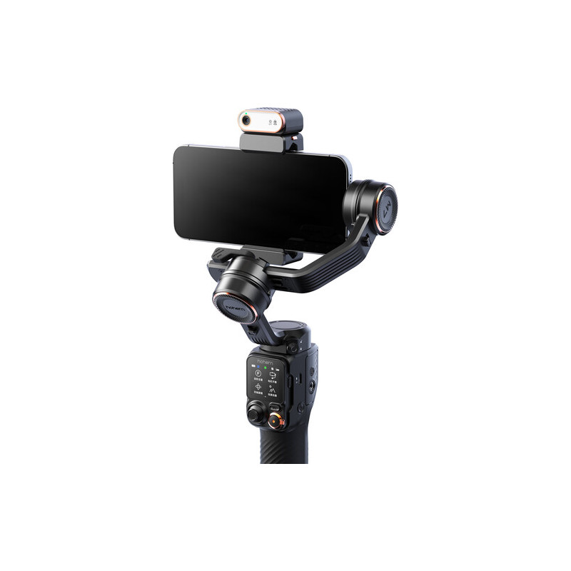The stabilizer uses powerful motors and a 3-axis structure that compensates for pan, tilt and roll movements. The range of movement reaches 360° Pan, 45° Roll and Tilt from -50° to 275°, allowing for smooth transitions and natural movements during dynamic shooting. The sports mode is optimized for faster movements, while the locked mode maintains a fixed frame for static scenes and interviews.