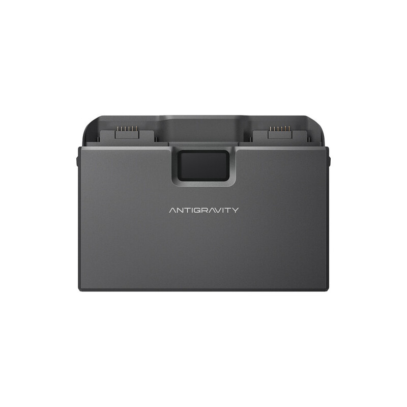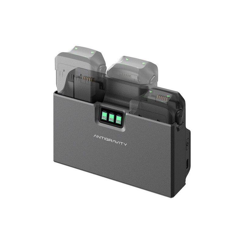 The Antigravity A1 Flight Battery Charging Hub is a compact charging hub designed for Antigravity A1 Flight batteries, which allows sequential charging of up to 3 batteries via USB-C power with PD support. It has 3 slots, charging one battery in about 45 minutes and three in 135 minutes. The built-in LCD display shows the charging status, and the ability to use the power bank mode allows it to be used as an external power supply. The foldable design, compact dimensions and low weight make it convenient for field work and travel.