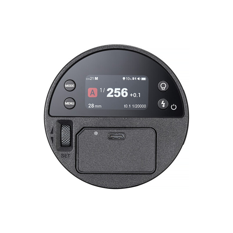 The control is implemented via a color HD display and optimized buttons, and the color-coded groups make it easier to navigate when working with multiple flashes. The housing features a magnetic front bayonet compatible with Godox round accessories, as well as two 1/4"-20 mounting holes and an included adapter.