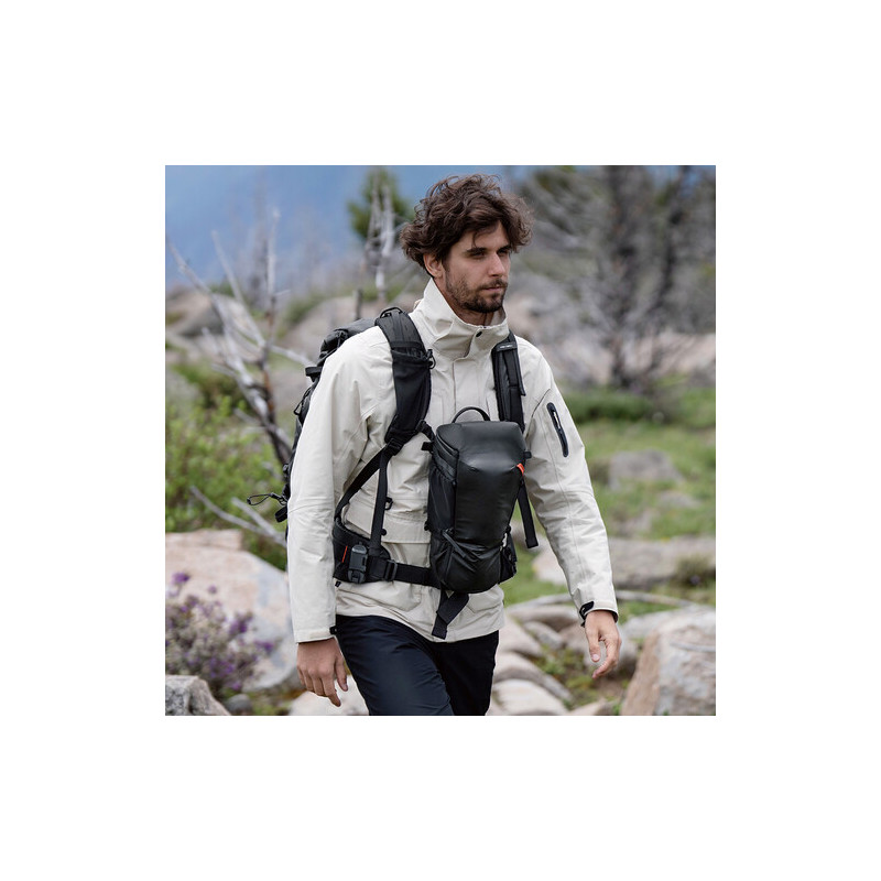 The bag offers flexible carrying options, with the included shoulder strap or via mounting loops for attaching to a belt or backpack. This allows for adaptation to different work styles and workloads. An additional external bottle pocket increases practicality for longer walks or outdoor shooting.
