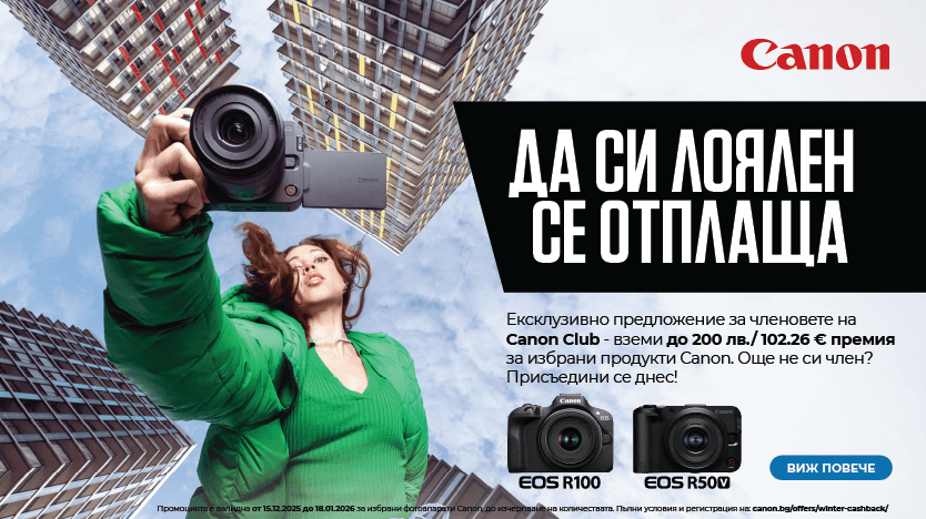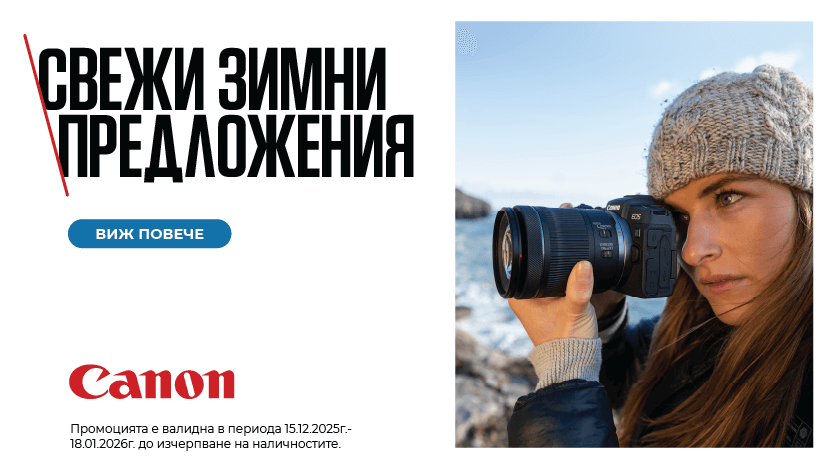 и купи до 18.01.26 избрани фотоапарати Canon от магазини ФотоСинтезис с до 1022.58 € / 2000 лв. отстъпка, директно начислена в крайната цена